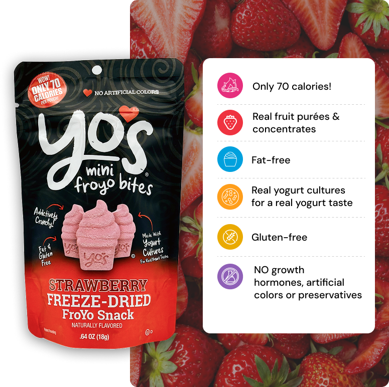 That's right! Crunchy, freeze-dried frozen yogurt that will have you screaming for more! Bite down and feel the crunch or let every Yo’s® mini froyo bite melt away around your taste buds and enjoy a symphony of fruit and froyo together like never before!